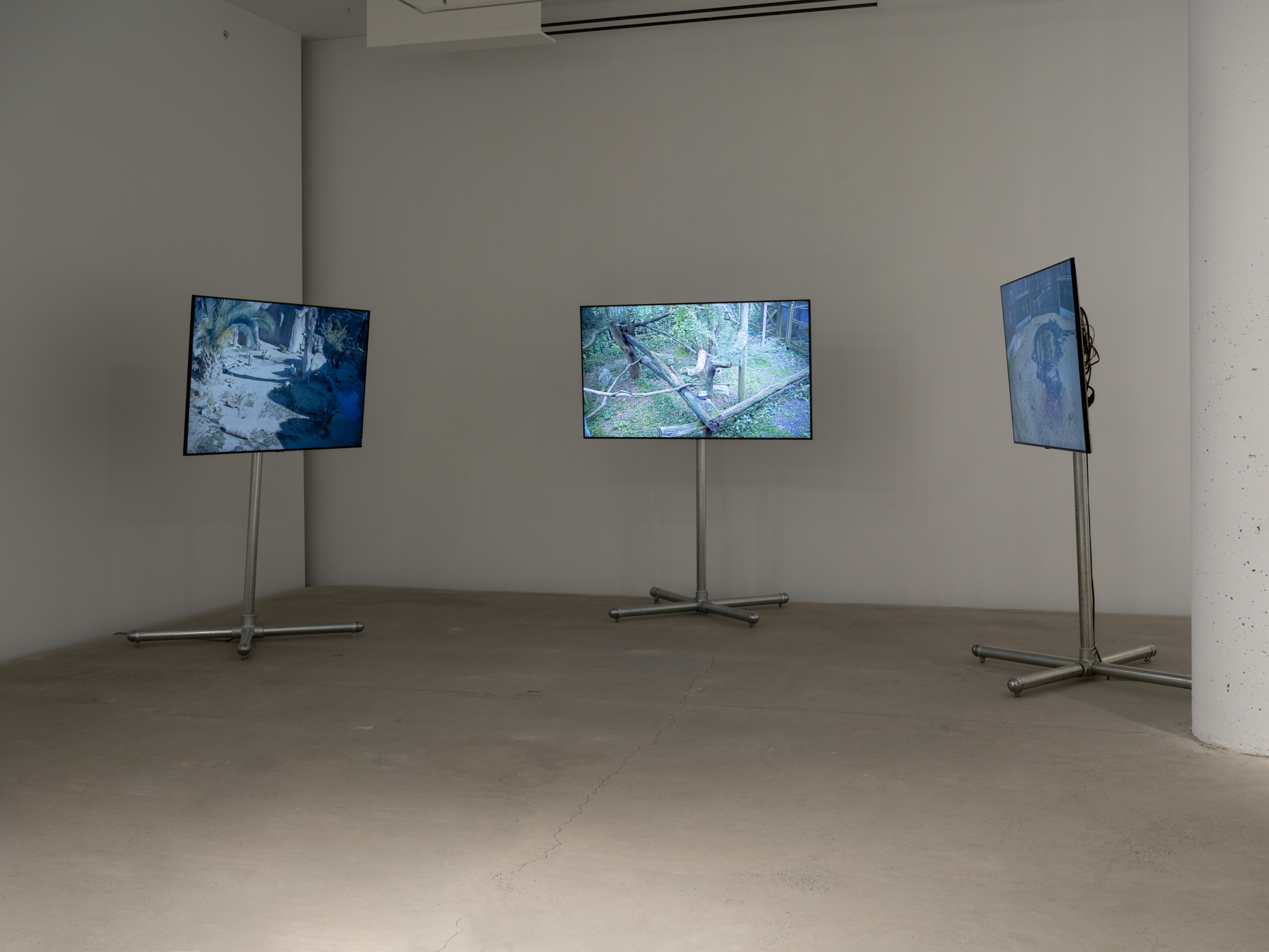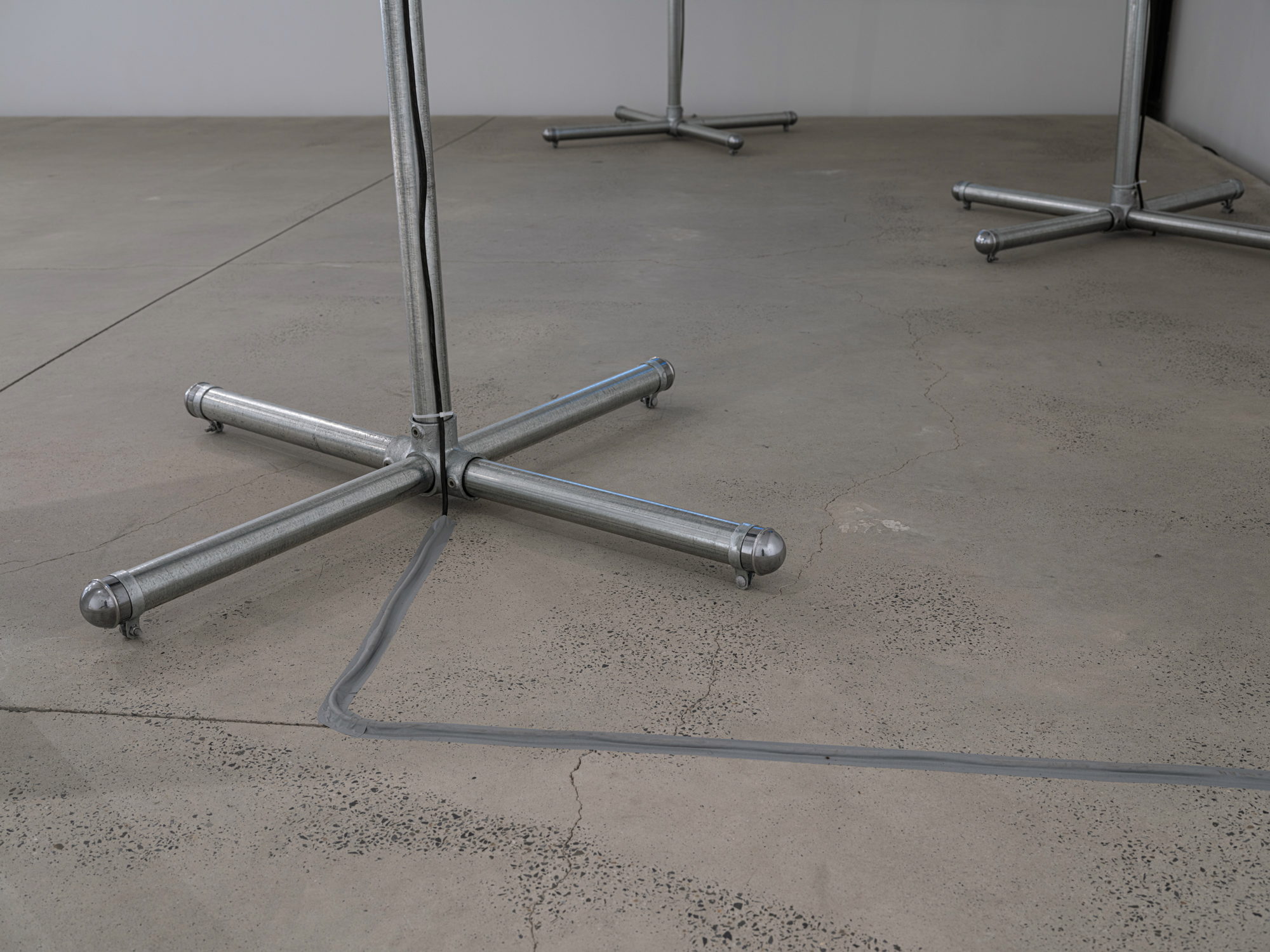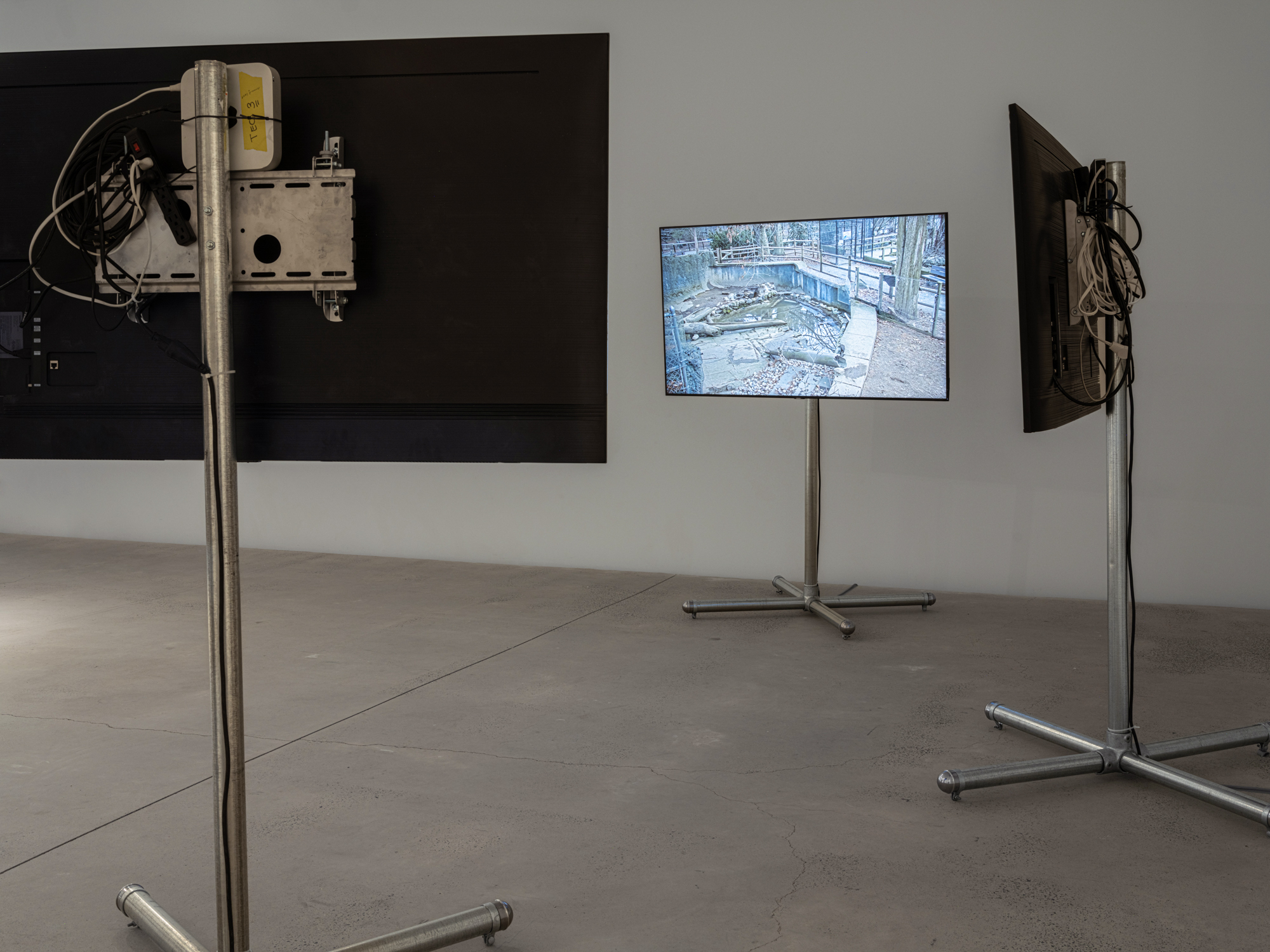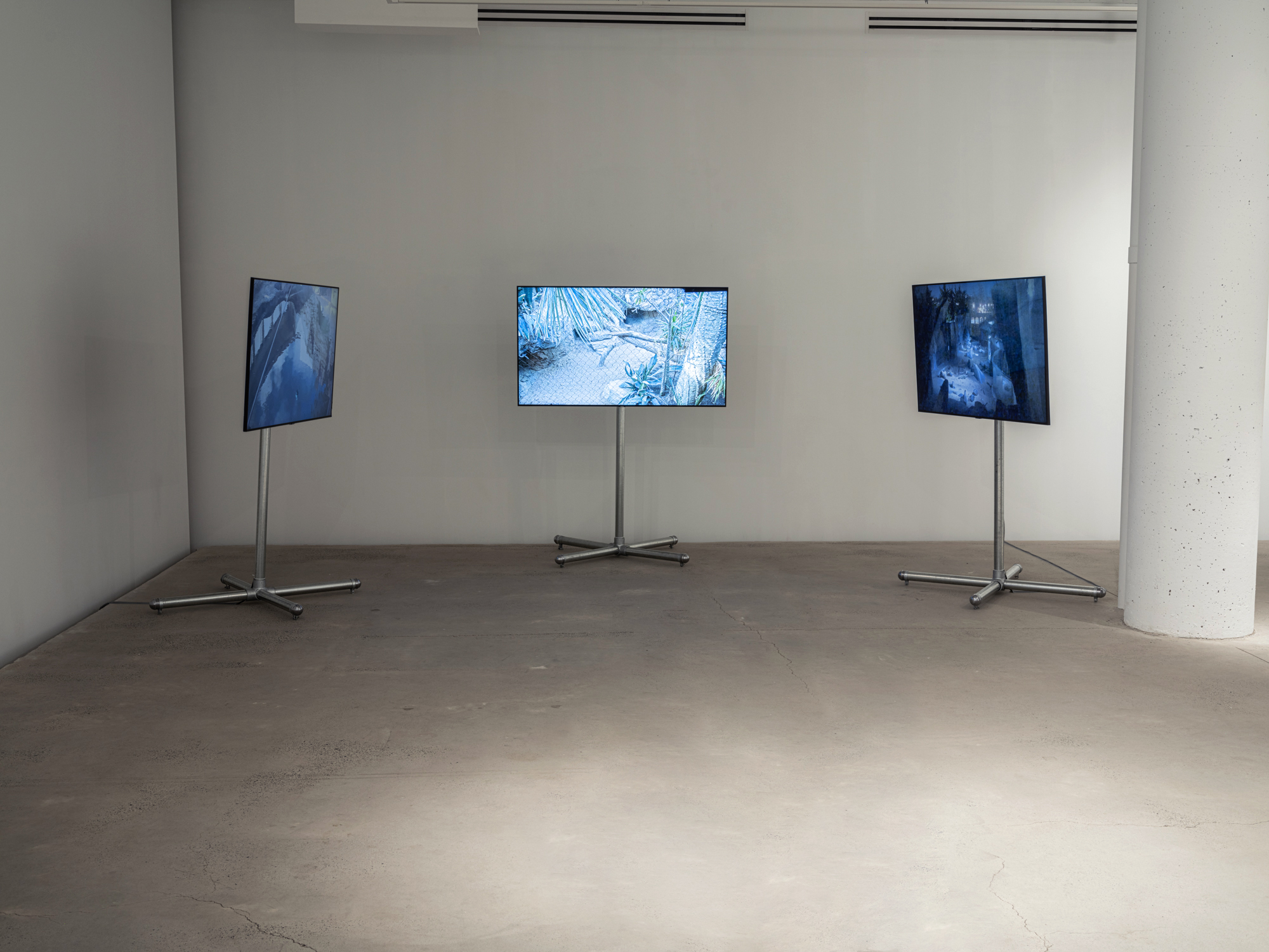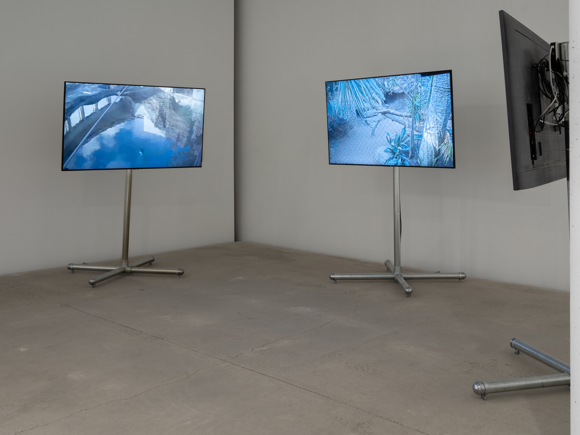 Three-channel video, HD monitors, galvanized steel posts, pipe fittings, fence caps, brace bands